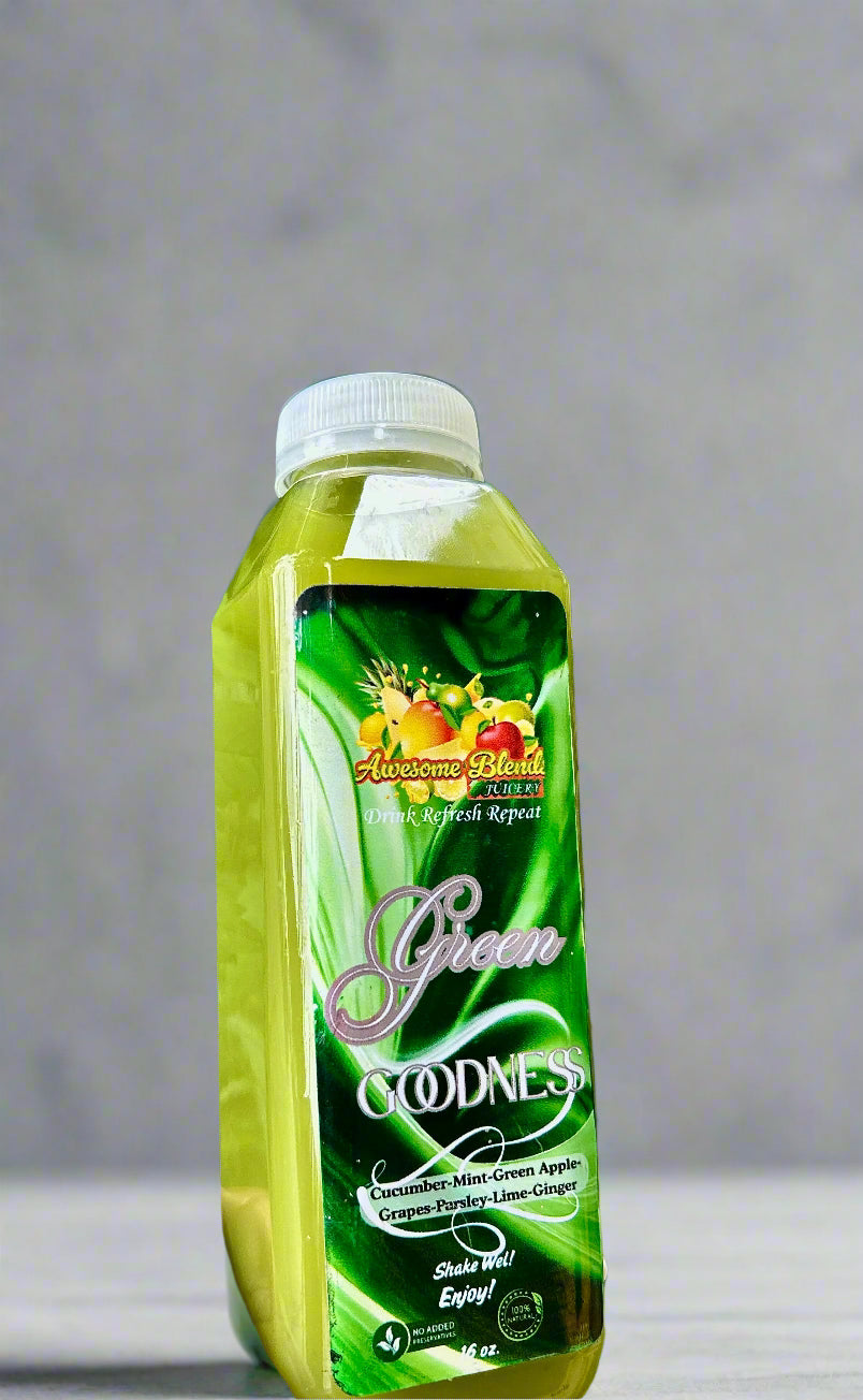 Experience the refreshing and invigorating taste of our Green Goodness Juice. Made with fresh cucumber, mint, green apple, grapes, parsley, lime, and ginger, this juice is packed with nutrients and natural flavors. Start your day off right with a sip of this powerful, green drink!